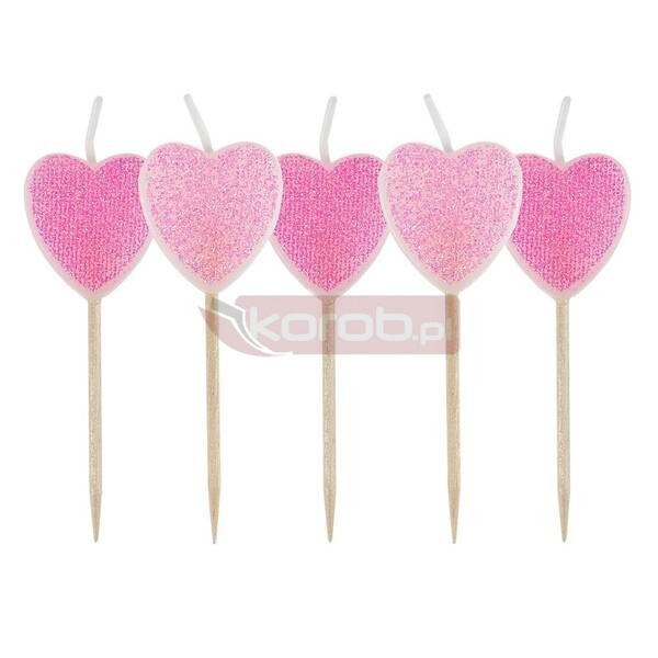 Zestaw 5 świeczek w kształcie serc w dwóch odcieniach różowego z brokatem. Świeczki na piku, łatwe do umieszczenia na torcie, babeczkach. Dekoracja słodkiego stołu, przyjęcia z okazji walentynek, rocznicy, urodzin. Wymiary świeczki: 2,5 x 2,3 x 0,6cm.