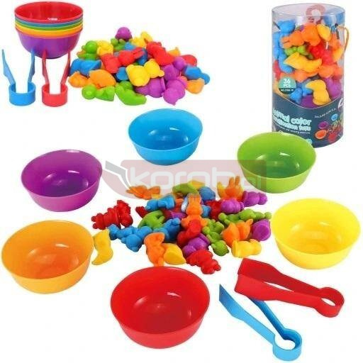 Gra edukacyjna Montessori, zwierzątka x 36 rozpoznawanie kolorów i kształtów. W zestawie kolorowe misie, szczypce, kolorowe miseczki do segregowania.