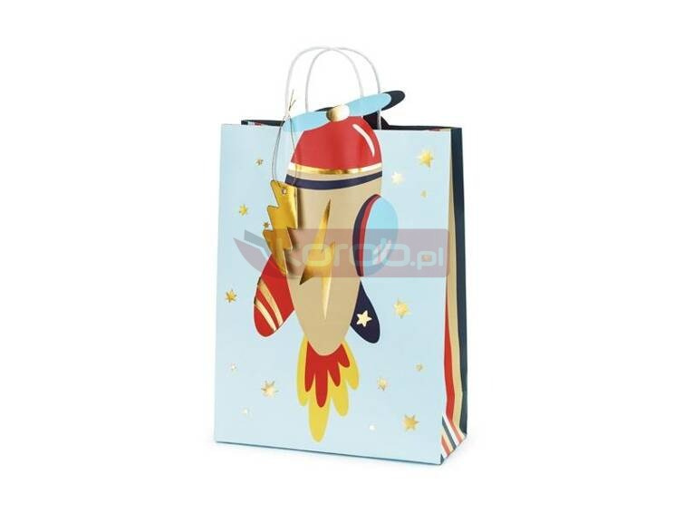 Torebka na prezenty Samolot, mix kolorów z zawieszką w kształcie pioruna w kolorze złotym, wymiary bez uchwytów 10 x 35.5 x 24 cm.