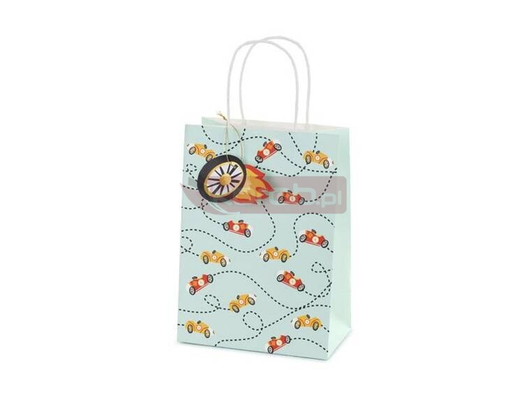 Torebka na prezenty Autka, mix kolorów z zawieszką w kształcie płonącego koła, wymiary bez uchwytów 10.5 x 18 x 25 cm.