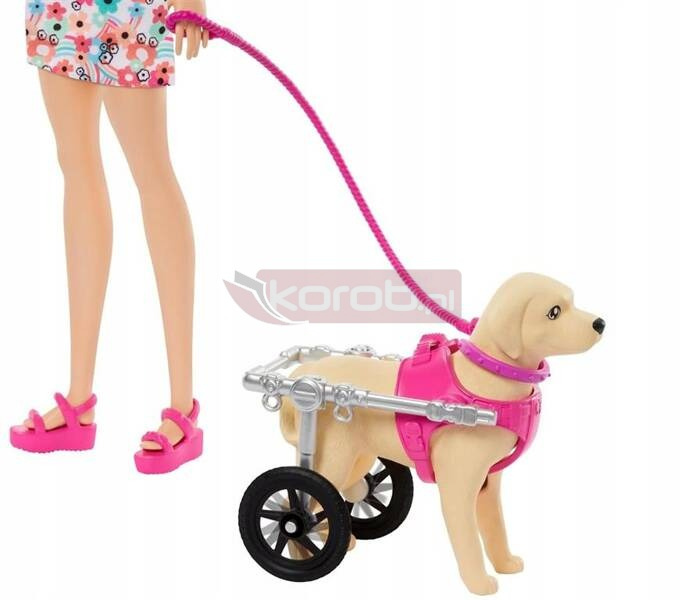 Zakochaj się w parze uroczych piesków wraz z Barbie! W tym zestawie znajdziesz szczeniaczka oraz dorosłego psa ze zwierzęcym wózkiem inwalidzkim (z obracającymi się kółkami!). Te śliczne pieski uwielbiają spacery z Barbie! Wózek możesz przyczepiać do pieska, który potrzebuje trochę dodatkowej opieki i miłości. Wśród akcesoriów są miseczka na jedzonko, legowisko, smycz pasująca do rączki lalki i pyszne „kostki”. Dzieci od 3 roku życia mogą pomagać lalce Barbie troszczyć się o zwierzęcych przyjaciół.