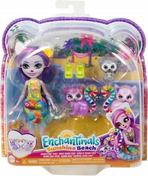 Kolekcja lalek Enchantimals™ jest inspirowana grupą uroczych przyjaciół, którzy zawsze świetnie się bawią z ukochanymi zwierzątkami. Wybierz się na Słoneczną Plażę! Lalka Lorinda Lemur™ (15 cm) i 3 figurki lemurków, w tym zwierzaczek Ringer, to najlepsi przyjaciele. Uwielbiają spędzać razem czas, malować portrety i bawić się na piaszczystej plaży. Lorinda wygląda ślicznie w plażowym topie (plastikowym) i zdejmowanej spódniczce. Dwie figurki zwierzątek można ułożyć tak, aby ich ogonki uformowały serduszko. Jak słodko! Dzieci będą chciały zebrać je wszystkie.