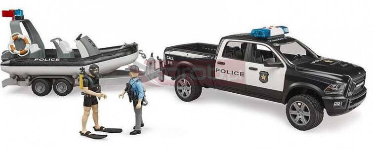 Bruder 02507 Pick-up policja RAM 2500 policyjny z łodzią figurką policjanta oraz nurka.