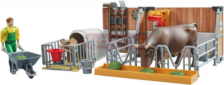 Zestaw figurek Obora z figurką krowy, cielaka, rolnika