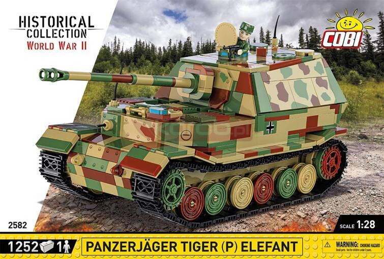 Elefant to ciężkie działo pancerne / niszczyciel czołgów używane przez Niemców w czasie drugiej wojny światowej. Wśród fanów historii oraz techniki wojskowej pojazd do dzisiaj cieszy się ogromnym zainteresowaniem i rozpoznawalnością! Klockowy model tego bardzo znanego pojazdu z okresu drugiej wojny światowej został zaprojektowany w skali 1:28 przy wykorzystaniu 1252 elementów i ma aż 28,5 cm długości. Klocki oraz figurka zawierają wysokiej jakości nadruki. Tutaj nie znajdziesz naklejek! Funkcjonalności modelu to: wyjmowana klockowa replika silnika, działająca trakcja gąsienicowa, działo, którym można poruszać w pionie i poziomie, odtworzone elementy wnętrza i otwierane włazy. W zestawie znajduje się również szczegółowo odwzorowana figurka członka załogi pojazdu wraz z akcesoriami w postaci pistoletu maszynowego oraz kanistra. Całość zestawu uzupełnia tabliczka zawierająca nadrukowaną nazwę pojazdu. Szczegółowy i bardzo duży model ciężkiego niszczyciela czołgów to pozycja obowiązkowa dla kolekcjonerów i pasjonatów historii. Pierwsza wersja niemieckiego ciężkiego niszczyciela czołgów została nazwana Ferdinand na cześć jego projektanta Ferdynanda Porsche. Nieco ulepszona wersja tego pojazdu, wyposażona m.in. w karabin maszynowy w przedniej części i kopułkę dowódcy została nazwana Elefant. COBI przygotowało obie wersje! Panzerjager Tiger (P) Elefant został skonstruowany na podwoziu czołgu Tiger I. Produkcję seryjną rozpoczęto w 1943 roku na początku pod nazwą Ferdinand. Ferdinandy brały udział w walkach na froncie wschodnim m.in. podczas bitwy na Łuku Kurskim. Niszczyciele czołgów były uzbrojone w potężne działo przeciwpancerne PaK 43/2 L/71 kal. 88 mm, co sprawiało, że były skuteczne przeciwko niemal wszystkim pojazdom przeciwnika. Gruby pancerz zapewniał dobrą ochronę pojazdu. Mimo imponujących statystyk Ferdinandy miały również pewne wady. Zaliczamy do nich ograniczoną mobilność, awarie silników i zawieszenia oraz podatność na ataki piechoty. Po bitwie pod Kurskiem 48 ocalałych pojazdów zostało poddane modernizacji i zmieniono ich nazwę na Elefant. Dodano m.in. dodatkowe opancerzenie, karabin maszynowy na przodzie oraz kopułkę dowódcy i zimmerit. Elefant był jednym z najpotężniejszych pojazdów niemieckich, które pojawiły się na polu walki podczas II wojny światowej. Rola, jaką odegrał w zmaganiach wojennych, była jednak ograniczona ze względu na niewielką produkcję tego modelu. Pojazd ten do dzisiaj rozpala wyobraźnię pasjonatów historii i techniki wojskowej. Jest też jednym z najbardziej rozpoznawalnych pojazdów z okresu drugiej wojny światowej. Buduj historię, klocek po klocku! 1252 wysokiej jakości elementy, wyprodukowane w UE przez firmę z ponad 35-letnią tradycją, spełniają normy bezpieczeństwa dotyczące produktów dla dzieci, w pełni kompatybilne z innymi markami klocków konstrukcyjnych, zastosowano tylko trwałe nadruki bez użycia naklejek, czytelna i intuicyjna instrukcja oparta na rysunkach i ikonach, 1 figurka, tabliczka z nazwą, skala 1:28, wymiary modelu (dł x szer x wys): 285 mm (11.2") x 125 mm (4.9") x 140 mm ( 5.5")