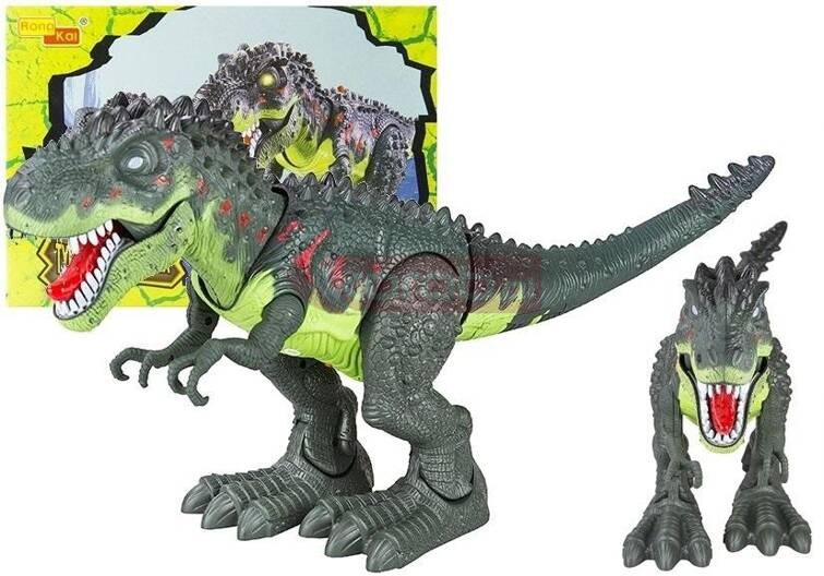 DUŻY DINOZAUR NA BATERIE ZE ŚWIATŁEM I DŹWIĘKIEM Dinozaur Tyranozaur Rex Po zamontowaniu baterii dinozaur zaczyna chodzić, ruszać głową i ogonem. Zabawie towarzyszą efekty świetlne i dźwiękowe. Dinozaur posiada świecący język i oczy, które świecą podczas chodzenia. Dinozaur w kolorze zielonym ucieszy miłośników wielkich gadów. Dinozaur zasilany jest bateriami AA (brak w zestawie). Zabawka zapakowana w kolorowe pudełko idealnie nadaje się na prezent Wymiary dinozaura: 48x22x14 cm [długość x wysokość x szerokość] Wymiary opakowania: 29x21x15 cm