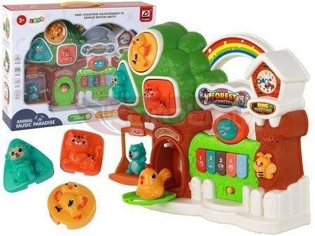 Zestaw Pianinko Koncert Las Zwierzątka Panel Edukacyjny Pianinko koncert w lesie dla dzieci to niezwykła i edukacyjna zabawka, która łączy w sobie elementy muzyczne, sensoryczne oraz interaktywne, tworząc fascynujące środowisko dla najmłodszych. Pianinko ma kształt uroczego lasu, co od razu przyciąga uwagę dziecka. Cała konstrukcja jest przemyślana tak, aby zachęcać malucha do odkrywania różnych elementów. Drzewko pianinka pełni funkcję nie tylko ozdobną, ale także stanowi interaktywną przestrzeń. Na jego gałęziach zawieszona jest huśtawka, na której może huśtać się uroczy ptaszek lub miś, będący częścią zestawu. To nie tylko element zabawy, ale także stymulacja ruchowa dla dziecka. Na koronie drzewa znajduje się panel edukacyjny, który rozbudza zmysły malucha. Kiedy dziecko naciśnie elementy kotka, ptaszka lub małpki, każdy z nich wydaje charakterystyczne dźwięki. To doskonały sposób na rozwijanie zdolności słuchowych i koordynacji ruchowej. Dodatkowo, w pniu drzewa umieszczona jest norka z drzwiami, co dodaje elementu zaskoczenia i zachęca do odkrywania różnych miejsc. Maluch może eksplorować tę ukrytą przestrzeń, co rozwija zdolności poznawcze i zdolności manipulacyjne. Na zielonym panelu, przypominającym łąkę, umieszczone jest pianinko. Posiada ono pięć przycisków z melodią nut oraz odgłosami zwierząt. Dzięki temu dziecko może nie tylko rozwijać swoje umiejętności muzyczne, ale także poznawać dźwięki charakterystyczne dla różnych zwierząt. Całość zabawki tworzy harmonijną i interaktywną przestrzeń, która rozwija zmysły dziecka, pobudza wyobraźnię oraz kształtuje podstawowe umiejętności. Pianinko koncert w lesie to nie tylko zabawka, ale także narzędzie do wszechstronnego rozwoju najmłodszych. Wymiary pianinka: 30 cm x 28 cm x 7 cm Wymiary opakowania: 36 cm x 28 cm x 9 cm Efekty dźwiękowe i świetlne zasilane są trzema bateriami 1.5 AA, które nie są elementem zestawu. Posiada certyfikat CE, ponadto jest zgodny z normą EN71. Zabawka przeznaczona jest dla dzieci powyżej 3 roku życia.