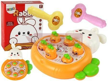 Gra Królik Do Zbijania Marchewki Zręcznościowa Whac-A-Mole Gra zręcznościowa "Wyskakujące Marchewki" to dynamiczna i zabawna rozrywka dla dzieci, która nie tylko dostarcza radości, ale także rozwija umiejętności zręcznościowe, czas reakcji i skupienie. Gra posiada panel z uroczym motywem królika, który dodaje elementu przyjemnej estetyki i przykuwa uwagę dzieci. Animowane obrazy królika dodają wesołego nastroju podczas zabawy. Zestaw zawiera specjalne pole, na którym umieszczono sześć marchewek. Marchewki wyskakują z losowych otworów na polu, co sprawia, że gra staje się bardziej ekscytująca i nieprzewidywalna. Do zestawu dołączone są dwa młotki, umożliwiające jednoczesną zabawę dwóm graczom. Młotki są lekkie i łatwe do obsługi przez dzieci, co sprawia, że gra jest dostosowana do najmłodszych użytkowników. Zadaniem graczy jest jak najszybciej reagować na wyskakujące marchewki i zbić je za pomocą młotków. Punkty są przyznawane za każdą zbijaną marchewkę, a gracz, który zebrał najwięcej punktów, wygrywa. Gra stanowi doskonałe ćwiczenie dla zdolności czasu reakcji u dzieci, zachęcając do szybkiego i skoordynowanego działania. Wymaga również skupienia i spostrzegawczości, co rozwija umiejętność koncentracji. Gra zręcznościowa "Wyskakujące Marchewki" to nie tylko świetna zabawa, ale także skuteczna metoda rozwijania zdolności zręcznościowych i reakcji u dzieci. To interaktywna forma rozrywki, która angażuje i bawi jednocześnie, stymulując rozwój umiejętności motorycznych i koncentracji. Wymiary panelu z marchewkami: 20 cm x 18 cm x 5 cm Wymiary opakowania : 20 cm x 17 cm x 6 cm Zabawka przeznaczona jest dla dzieci powyżej 3 roku życia. Zestaw posiada certyfikat CE i jest zgodny z normą EN 71.