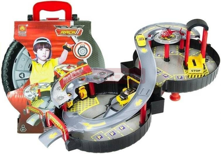 DWUPOZIOMOWY PARKING GARAŻ SKŁADANY W OPONIE WALIZKA Zestaw zawiera: - Parking wraz z akcesoriami składany w walizkę "koło" wraz z dwoma samochodami i helikopterem. Funkcje: 1. Parking posiada 2 autka i helikopter. 2. Parking można złożyć do walizeczki, dzięki czemu zajmuje mało miejsca, a dziecko może go wszędzie ze sobą zabrać. 3. Zestaw zawiera windę dla autek, windę obsługuje się za pomocą pokrętła. 4. Parking posiada obrotową myjnię samochodową z podnoszonym kanałem. 5. W zestawie znajduje się zabawkowa stacja benzynowa. 6. Parking posiada lądowisko dla helikoptera. Wymiary opakowania: 35,5 x 28 x 10 cm Wymiary parkingu złożonego w oponę: 35,8 x 28 x 10 cm Wymiary parkingu rozłożonego: - długość 60 cm - szerokość 28,5 cm - wysokość: 35,5 cm