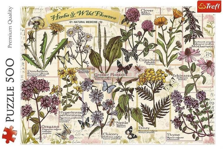 Puzzle Zielnik: Zioła lecznicze składające się z 500 elementów przedstawiają retro grafikę z roślinami, rodem ze startego zielnika. Po ułożeniu układanki powstanie obrazek o wymiarach 480x340 mm.