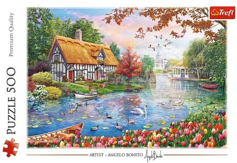 Puzzle Cicha przystań składają się z 500 elementów i po ułożeniu stworzą obraz artysty Angelo Bonito przedstawiający, otoczony kwiatami, dom nad rzeką. Gotowa układanka ma wymiary 480x340 mm.