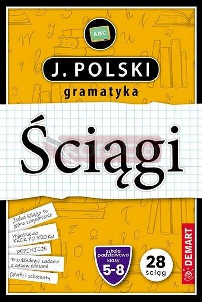Ściągi. Język polski. Gramatyka, czyli pierwsza pomoc w domu i w szkole dla uczniów klas IV-VIII w szkole podstawowej. Pakiet 28 dwustronnych, kolorowych, starannie graficznie opracowanych ściąg-kart edukacyjnych obejmuje wszystkie ważne tematy z zakresu gramatyki języka polskiego uwzględnione w podstawie programowej. Jedna karta dotyczy jednego tematu. Format ściąg jest nieprzypadkowy mają się zmieścić w zeszycie i być podpowiedzią wyjaśniającą i podsumowującą prezentowane zagadnienie krok po kroku. Wiele zagadnień ilustrują poglądowe grafy i schematy.