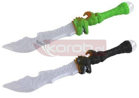 Miecz Świetlny z Dinozaurem! Ten niezwykły miecz nie tylko rozświetli Wasze przygody, ale także wprowadzi w fascynujący świat prehistorycznych stworzeń. Jego rękojeść w formie zielonego lub czarnego dinozaura to nie tylko ozdoba - to wstęp do epickiej podróży w czasie, gdzie potężne bestie rządzą krainą. Dwa guziki dają kontrolę nad dźwiękiem ryczącego dinozaura i efektami świetlnymi. Po włączeniu miecza światło LED ożywa w kolorowej eksplozji, a efekty dźwiękowe dodają realizmu co tworzy atmosferę świetnej zabawy. Aby uczynić Miecz Świetlny z Dinozaurem jeszcze bardziej fascynującym, warto dodać, że jego rękojeść została zakończona świecącą kulą. Ta dodatkowa atrakcja nie tylko nadaje mieczowi dodatkowego blasku, ale także tworzy efektowny kontrast do zielonej rękojeści w kształcie dinozaura. Solidna konstrukcja miecza sprawia, że jest gotowy na najbardziej ekscytujące przygody. Pomimo swojej imponującej prezencji, został zaprojektowany z myślą o bezpieczeństwie najmłodszych. Miecz nie posiada ostrych krawędzi, co gwarantuje bezpieczną zabawę. Teraz każde pojedynki i potyczki stają się jeszcze bardziej beztroskie, a dzieci mogą cieszyć się fascynującym doświadczeniem. Miecze dostępne w dwóch wariantach kolorystycznych. Zielony lub czarny - wysyłany losowo. Miecz zasilany jest na baterie 3x 1.5V AA, które nie są elementem zestawu. Wymiary miecza: 61cm x 9,5cm x 5,5cm Wymiary opakowania: 65,5cm x 14cm x 5,5cm Posiada certyfikat CE, ponadto jest zgodny z normą EN71. Przeznaczony dla dzieci powyżej 3 roku życia.