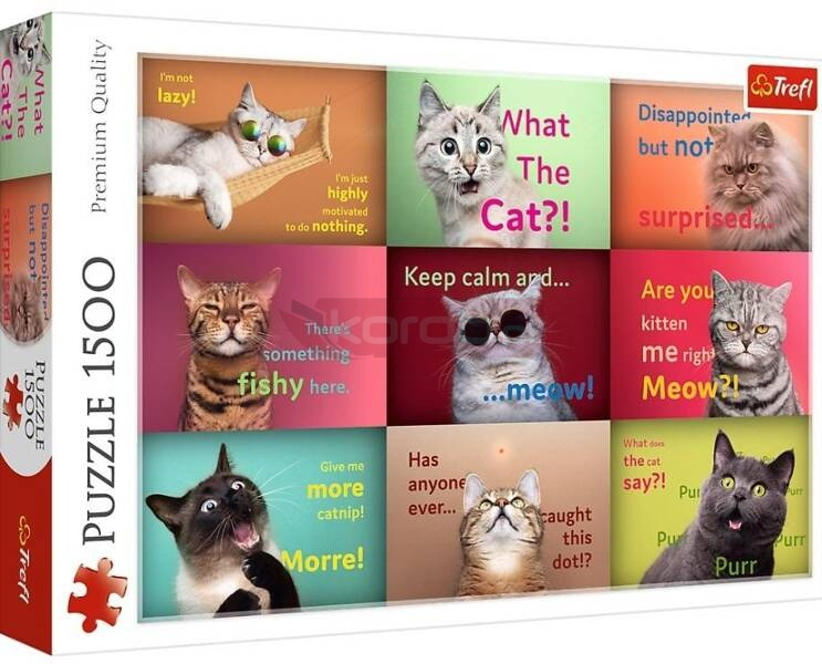 Puzzle Zabawne kocie portrety składają się z 1500 elementów i przedstawiają śmieszne memy z kotami w rolach głównych. Po ich ułożeniu powstanie obrazek o wymiarach 850x580 mm.