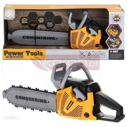 Imitacja linki rozruchowej z lewej strony służy do odpalania piły, wystarczy ją delikatnie pociągnąć, a urządzenie wyda dźwięk odpalania silnika. By włączyć łańcuch, należy wcisnąć i przytrzymać dolny guzik na rączce. Łańcuch jest gumowy i całkowicie bezpieczny dla dzieci, piła posiada realistyczne dźwięki