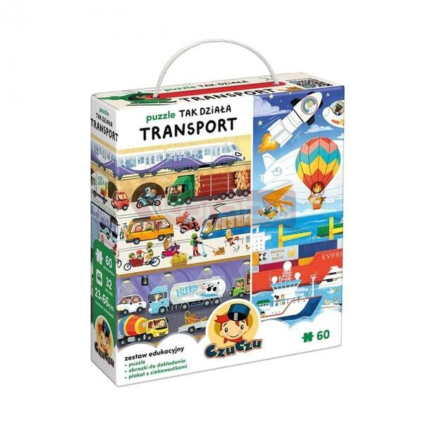 Puzzle Tak działa transport to wyjątkowy zestaw edukacyjny dla dzieci w wieku przedszkolnym, szczególnie jeśli lubią przeróżne pojazdy. Składa się z 60-elementowych puzzli, 32 obrazków do dokładania i plakatu edukacyjnego. Ruszamy do zabawy! Zwróćcie baczną uwagę na to, co jeździ po drogach, pływa po wodach i lata w powietrzu. Znane i lubiane oraz mniej oczywiste środki transportu to świetna motywacja do zabawy. Dzięki układaniu puzzli dzieci mogą rozwijać spostrzegawczość, cierpliwość i zdobywać nową wiedzę na wesoło.