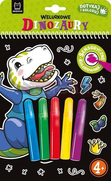 "Welurkowe dinozaury" to kolorowanka sensoryczna z dołączonymi pisakami. Tło obrazków pokrywa czarny welur, który podkreśla głębię kolorów, zapewnia wrażenia sensoryczne i ogranicza wychodzenie poza linię. Dzięki perforacji pokolorowaną pracę można oderwać, włożyć do ramki i podarować w prezencie lub ozdobić nią pokój.