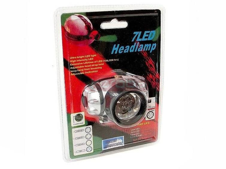 Latarka diodowa LED na czoło, 7 diod, 3 tryby świecenia, na baterie 3xAAA; 18x13x8,5cm, B/C