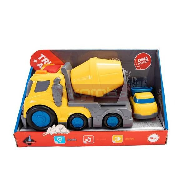 Zestaw autek 2w1 Betoniarka i mini wywrotka Betoniarka z napędem friction (23x11x12 cm) Mini wywrotka (10x5.5x6 cm) Efekty świetlne i dźwiękowe Zasilanie: 2xAA (brak w zestawie)