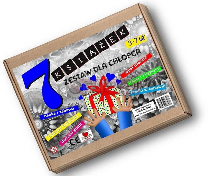 7 książek Wspaniały zestaw dla chłopca 3-7 lat Wspaniały mega zestaw 7 unikalnych książek edukacyjnych dla chłopca w wieku 3-7 lat. Zadania dostosowane do wieku, w ozdobnym pudełku, doskonala nadaje się na prezent. W zestawie znajdują się książki z zabawami manualnymi, łamigłówkami, ćwiczeniami wprowadzającymi dziecko w świat nauki przez zabawę. Dodatkowo w zestawie dodatki typu naklejki, plansze do wycinania i zabawy, kredki. Zestaw w pudełku, zabezpieczony folią. Format pudełka 25x35 cm Książki w formatach 21x29,7 cm oraz 21x21 cm.