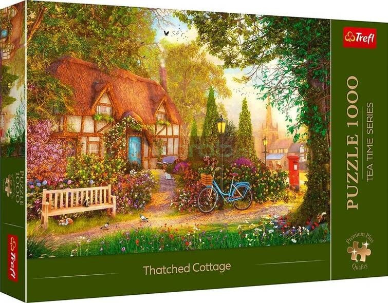 Puzzle Domek pod strzechą przedstawiają urokliwy domek w otoczeniu ogrodu pełnego kwiatów. Po ich ułożeniu powstanie obraz o wymiarach 683x480 mm.