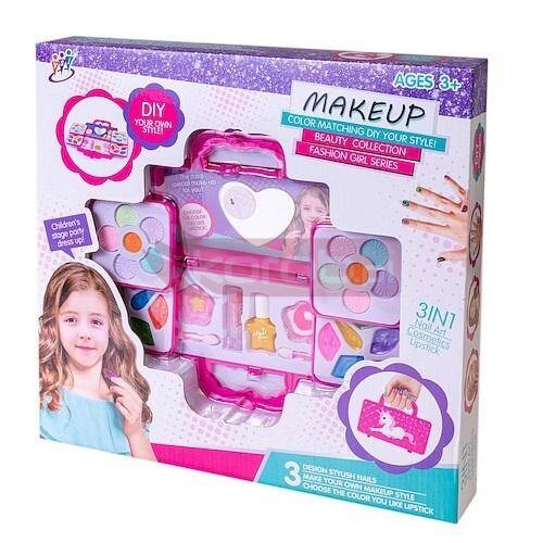 Zestaw kosmetyków dla małej damy. W 3-poziomowym kuferku znajdziesz wszystko, czego potrzebuje mała dama: cienie do powiek, pomadkę, lakier do paznokci i inne elementy