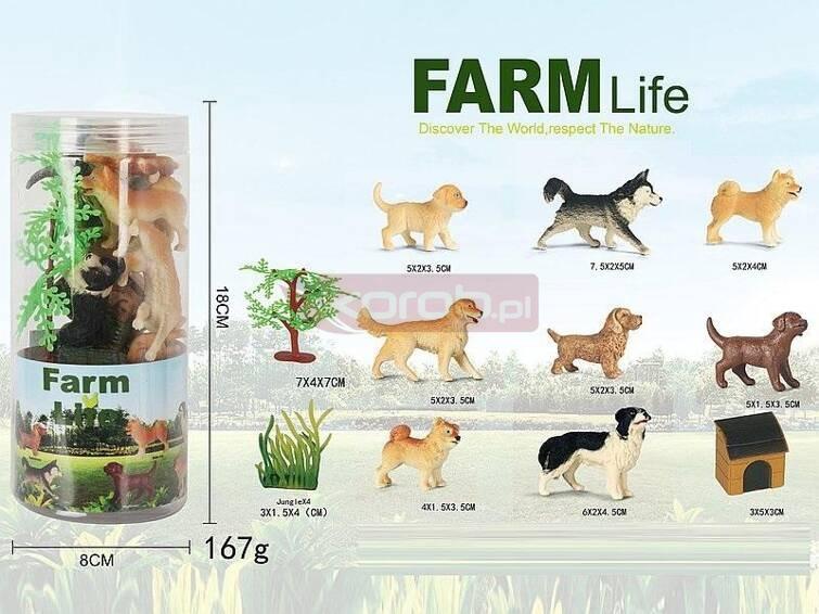 Zestaw 8 piesków, buda, drzewka, w tubie; 18x8x8cm, PVC