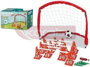 W zestawie: elementy do złożenia bramki o wymiarach 94 x 75 x 48 cm., 12 pachołków, gumowa piłka nożna, pompka do piłki, 4 kołki uziemiające, wym. opakowania: 30 x 18 x 14 cm., 3+