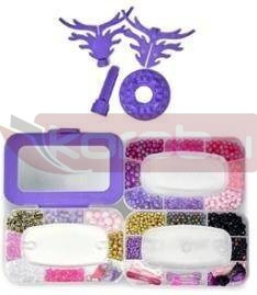 W zestawie: 20 rodzajów koralików w różnych kształtach, kolorach i rozmiarach, 7 różnych zawieszek, 8 kolorowych sznurków do nawlekania, lusterko, stojak na biżuterię, pudełko do przechowywania z uchwytem. Pozostałe informacje: wym. opakowania: 19 x 10 x 13 cm., 6+