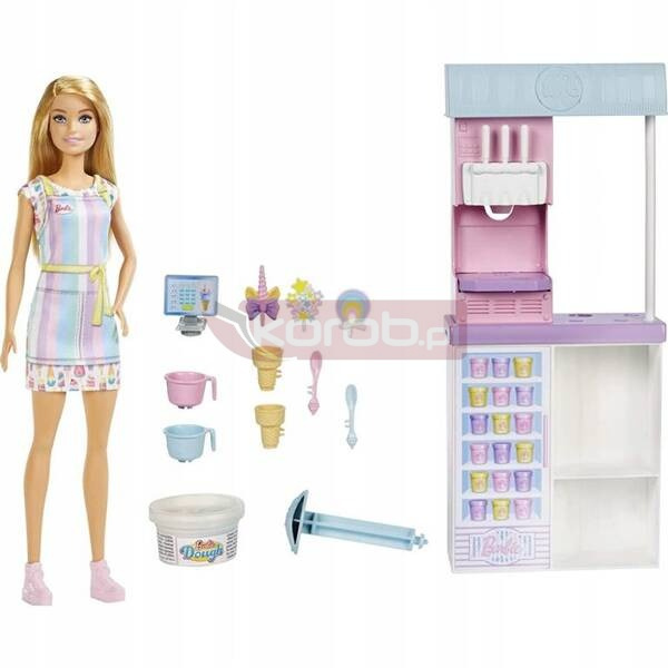 Wspaniały zestaw lodziarnia Barbie będzie fantastycznym prezentem dla każdej dziewczynki. Poznaj doświadczenie prowadzenia lodziarni dzięki zestawowi Barbie® Ice Cream Shop Playset! Dzieci uwielbiają lody, a dzięki temu zestawowi mogą prowadzić lodziarnię i robić pyszne lody w rożkach. Zestaw zawiera lalkę Barbie® , ubraną w uroczą sukienkę z lodami i pasiasty fartuch, lodziarnię oraz liczne akcesoria Dzieci mogą użyć dwóch rodzajów ciasta (różowego lub niebieskiego) i włożyć je do maszyny do lodów, pociągnąć za dźwignię i patrzeć, jak „lody” wirują, aby uzyskać realistyczne lody! Mogą użyć misek lub rożków i udekorować lody nakładkami, aby dopełnić smakołyk! Potem czas zadzwonić do kasy. Zestaw zawiera lalkę Barbie®, stanowisko do lodów, 2 kolory ciasta, 2 miski, 2 rożki, 3 ozdobne nakładki, 2 łyżki, uchwyt na rożek i kasę