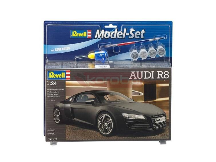 Zestaw modelarski z akcesoriami ( 4 podstawowe farbki, pedzelek, klej ). Audi R 8 - niemiecki samochód sportowy, dwudrzwiowy w wersji coupe. Zalecane kolory farb: 32101, 32102, 32107, 32109, 32151, 32190, 32191, 32301, 32330, 32374, 32730, 32731. Plastikowy model do sklejania Revell ( REV-67057 ). Specyfikacja Numer katalogowy:REV-67057 Producent: Revell Długość: 184 mm Skala: 1:24 Stopien trudności: 3 Ilość elementów: 106 Instrukcja: tak