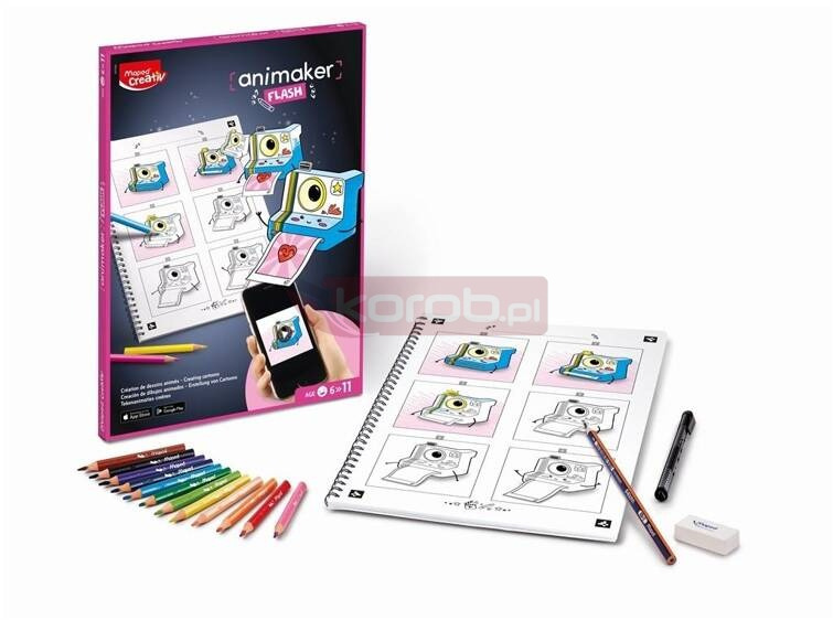 Maped Creativ proponuje zestaw Animaker Flash, który w połączeniu z darmową aplikacją, umożliwia nagranie 12 mini kreskówek na planie zaproponowanego szablonu lub według własnej, niczym nieograniczonej koncepcji.