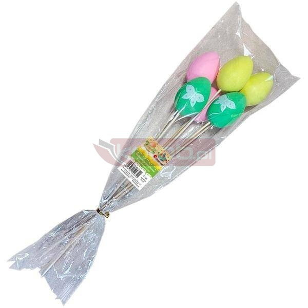 Jajka plastikowe 40 x 60 mm na piku jasnożółte, jasnozielone, jasnoróżowe z białym nadrukiem motyla - 6 szt.