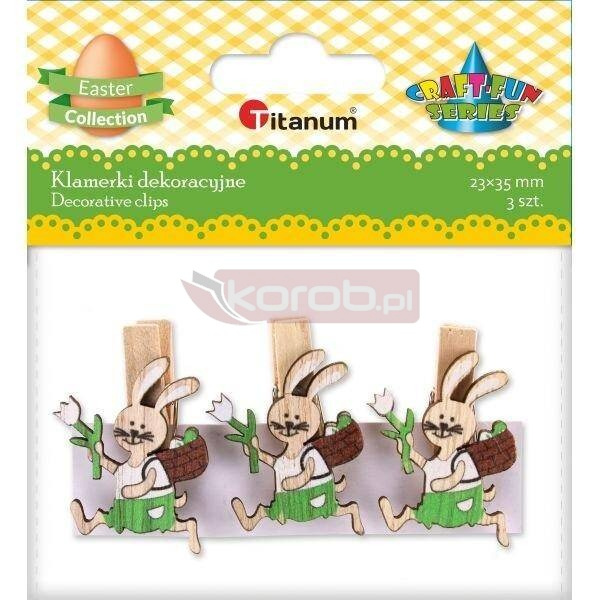 Klamerki drewniane z dekorem naturalne 7 x 35 mm królik z koszykiem pisanek i tulipanem 28 x 35 mm 3 szt.