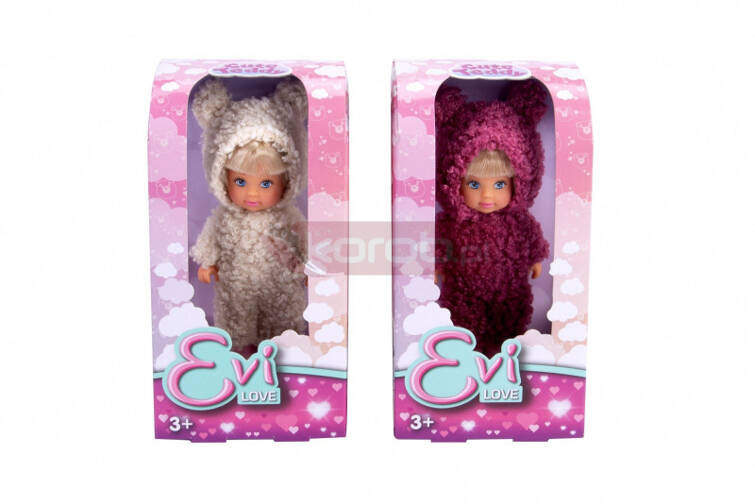 - EVI JAKO SŁODKIE MISIE: mała Evi w przytulnym stroju. Laleczka ma na sobie jednoczęściowy, pluszowy kostium z pluszowym kapturem z uszami, kremowy lub bordowy, każdy prezentuje się zachwycająco.