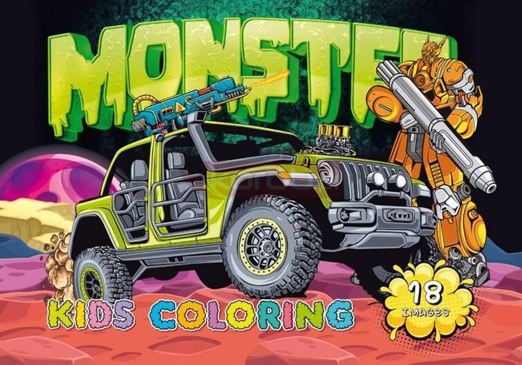 Kolorowanka A4 18 obrazków Potworne samochody Kolorowanka dla dzieci. Na każdym z 18 obrazków znajduje się obrazek z monster truckiem, który tylko czeka żeby nabrać kolorów. Wyprodukowana na Ukrainie.