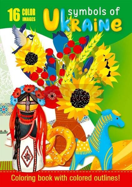 Kolorowanka dla dzieci z motywami ukraińskimi. W środku 16 obrazków, które czekają, aby nabrać kolorów. Wyprodukowana na Ukrainie.
