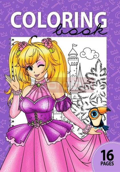 Kolorowanka dla dzieci z obrazkami księżniczek. W środku 16 obrazków do pokolorowania lub rozwiązania zagadek. Wyprodukowana na Ukrainie.