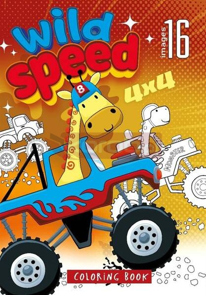 Kolorowanka dla dzieci. Na każdym z 16 obrazków znajduje się obrazek związany wyścigami monster trucków, który tylko czeka żeby nabrać kolorów. Wyprodukowana na Ukrainie.