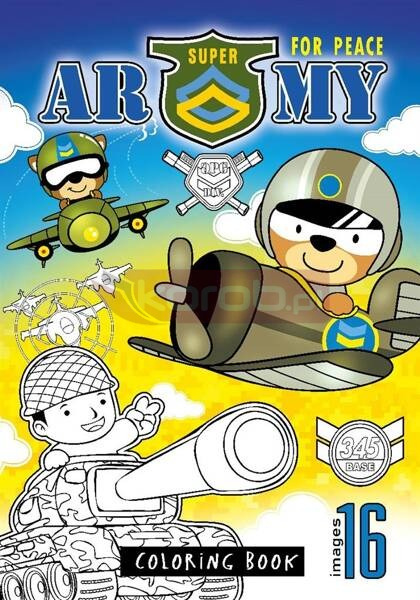 Kolorowanka dla dzieci. Na każdym z 16 obrazków znajduje się obrazek związany wojskiem, który tylko czeka żeby nabrać kolorów. Świetna zabawa dla każdego małego żołnierza! Wyprodukowana na Ukrainie.