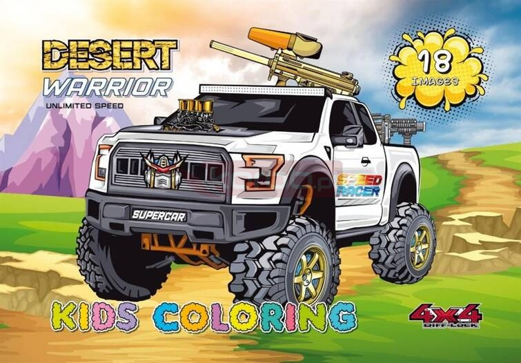 Kolorowanka A4 18 obrazków Wojownicy pustyni Kolorowanka dla dzieci. Na każdym z 18 obrazków znajduje się obrazek z monster truckiem, który tylko czeka żeby nabrać kolorów. Wyprodukowana na Ukrainie.