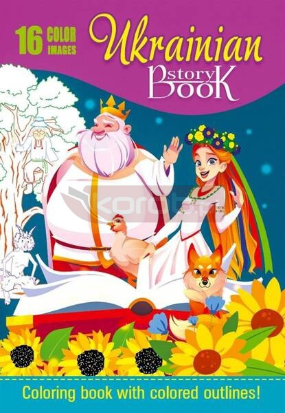 Kolorowanka dla dzieci z motywami ukraińskimi. W środku 16 obrazków, które czekają, aby nabrać kolorów. Wyprodukowana na Ukrainie.