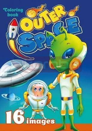 Kolorowanka dla dzieci o tematyce kosmosu. W środku znajduje się 16 obrazków nie z tej ziemi. Wyprodukowana na Ukrainie.