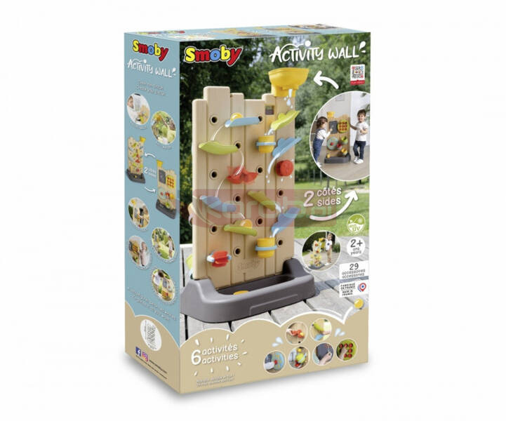 Dwustronna ścianka z aktywnościami dla dzieci wspomagającymi zdolności motoryczne i zręcznościowe. Z jednej strony ścianki zestaw rynienek po których może spływać woda lub piłka a z drugiej strony ścianki dzieci mogą bawić się w grę kółko i krzyżyk, trafiać piłeczkami w różnej wielkości koszyki lub naśladować różne pozy gimnastyczne umieszczone na kole z aktywnościami.