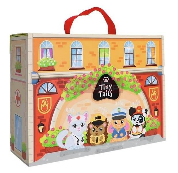 W zestawie: rozkładany kuferek z zamknięciem magnetycznym, 4 figurki zwierzątek, 4 pojazdy, 9 klocków drzewek, 14 puzzli do ułożenia drogi.