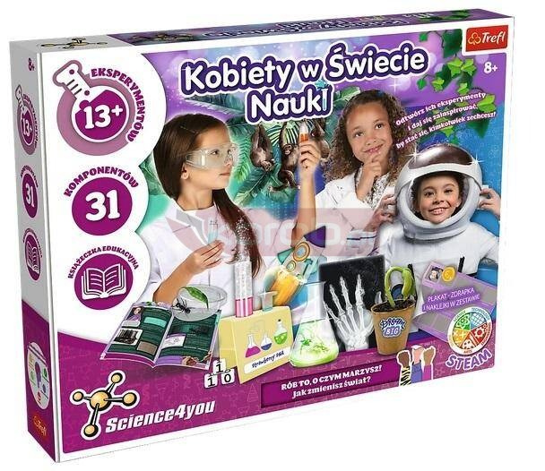 Z zestawem Kobiety w Świecie Nauki Science4you dowiesz się o niesamowitych kobietach i ich odkryciach naukowych. Odtwórz eksperymenty i i daj się zainspirować, by stać się kimkolwiek zechcesz! Zestaw prezentuje sylwetki 15 kobiet, które pomimo wszelkich przeszkód spełniły swoje marzenia i dokonały niesamowitych odkryć w dziedzinie STEM. Dowiedz się, jak zinterpretować zdjęcie rentgenowskie z Marią Skłodowską-Curie. Wyodrębnij i obserwuj DNA razem z Rosalind Franklin. Stwórz własny brelok z kodem binarnym i naucz się programować z Adą Lovelace. Zestaw zawiera książeczkę edukcyjną.