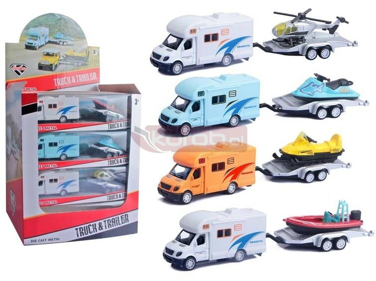 Kamper z przyczepą metalowy 16szt/display. Na przyczepie są dodatkowe pojazdy. Każdy kamper zapakowany jest w oddzielne opakowanie.