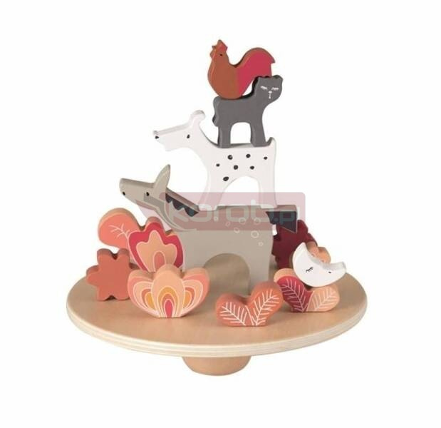 Drewniany dysk należy umieścić na okrągłej podstawie. Zadanie do wykonania to układanie po kolei na dysku figurek zwierzątek - muzykantów z Bremy.