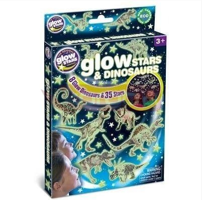 Wybierz się na jurajską przygodę z samoprzylepnymi, świecącymi dinozaurami i gwiazdami.Udekoruj swój pokój i ozdób swoje rzeczy prehistorycznymi motywami świecącymi w ciemności.Wystarczy wystawić naklejki na działanie źródła światła na kilka minut, wyłączyć światło i obserwować, jak świecą. Niekończąca się zabawa! Zawiera 35 plastikowych gwiazdek i osiem kolorowych dinozaurów. Twórz prehistoryczne projekty na sufitach i ścianach!