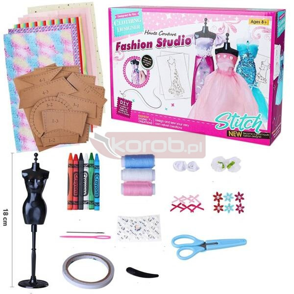 Zestaw do projektowania sukienek W zestawie kawałki materiałów, 3 manekiny, igły, nici, nożyczki, kredki, kokardki, taśma, dżety, wykrojniki Wymiary opakowania: 29 x 7 x 20 cm